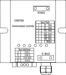 Bus address and baud rate of BINR CO v001/CANOPEN communication controller can be set by knob on panel, bus address is 1-9, baud rate is 20Kbps, 50Kbps, 125Kbps, 250Kbps, 500Kbps, 800Kbps, 1Mbps.