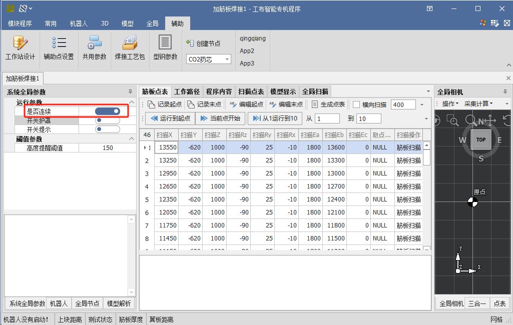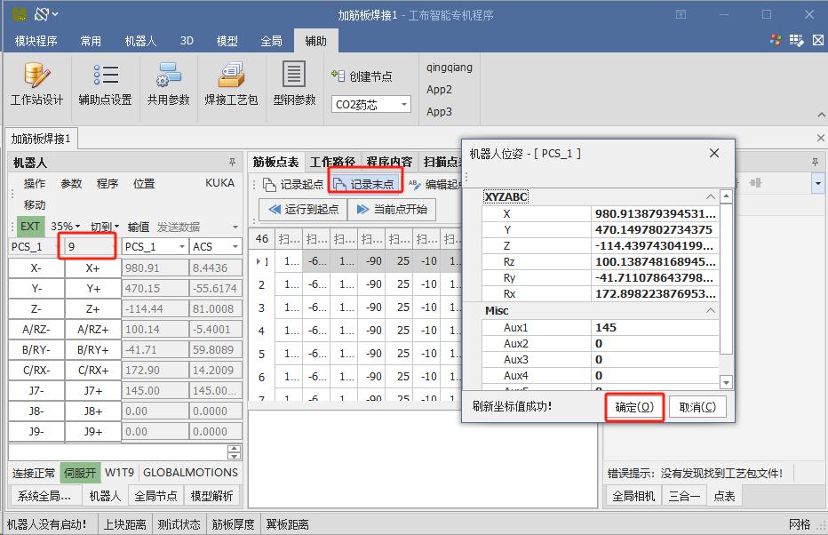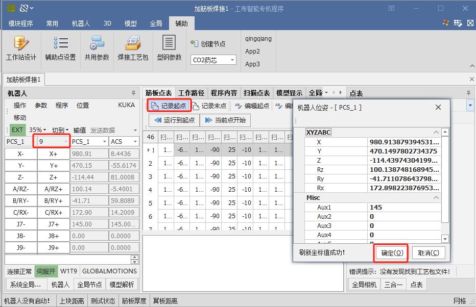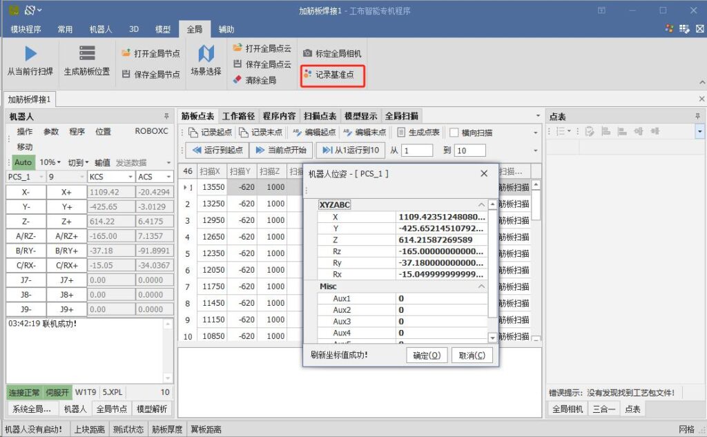 Adjust the robot to a suitable posture to coordinate with the auxiliary axis for scanning and welding. Once the posture is confirmed, click the “Record Reference Point” button under the global list.