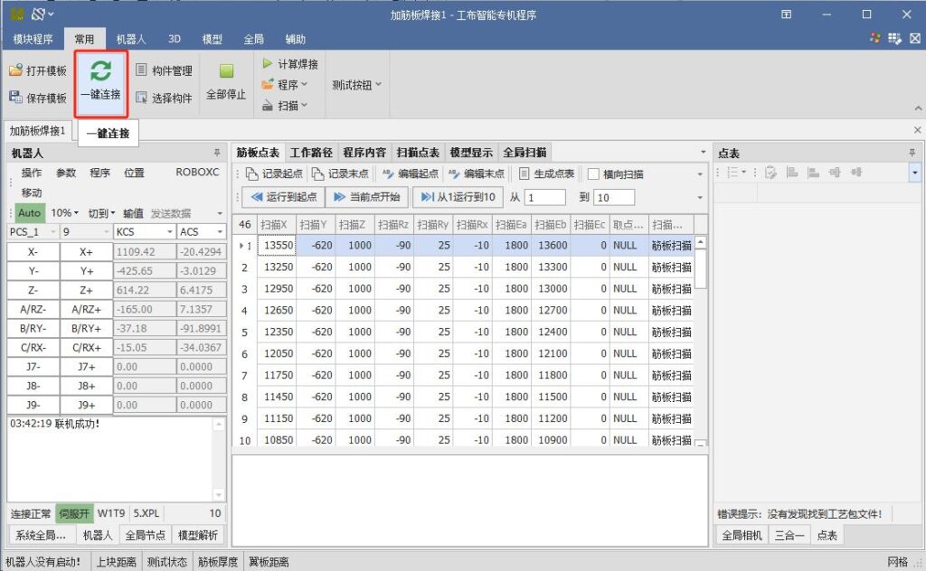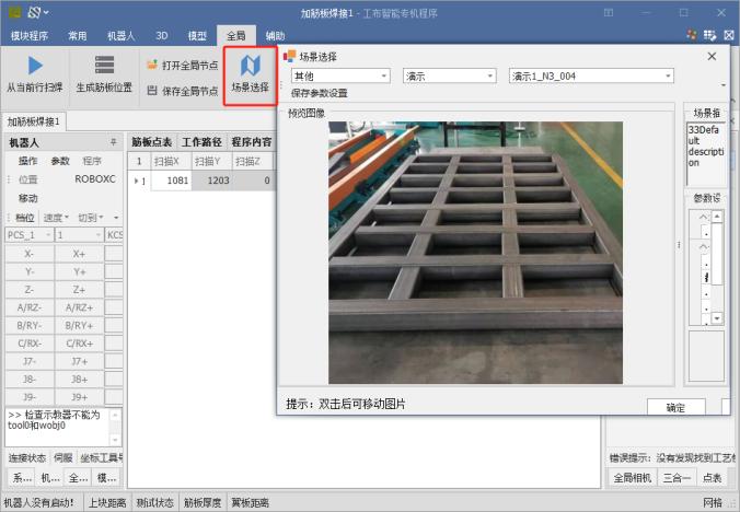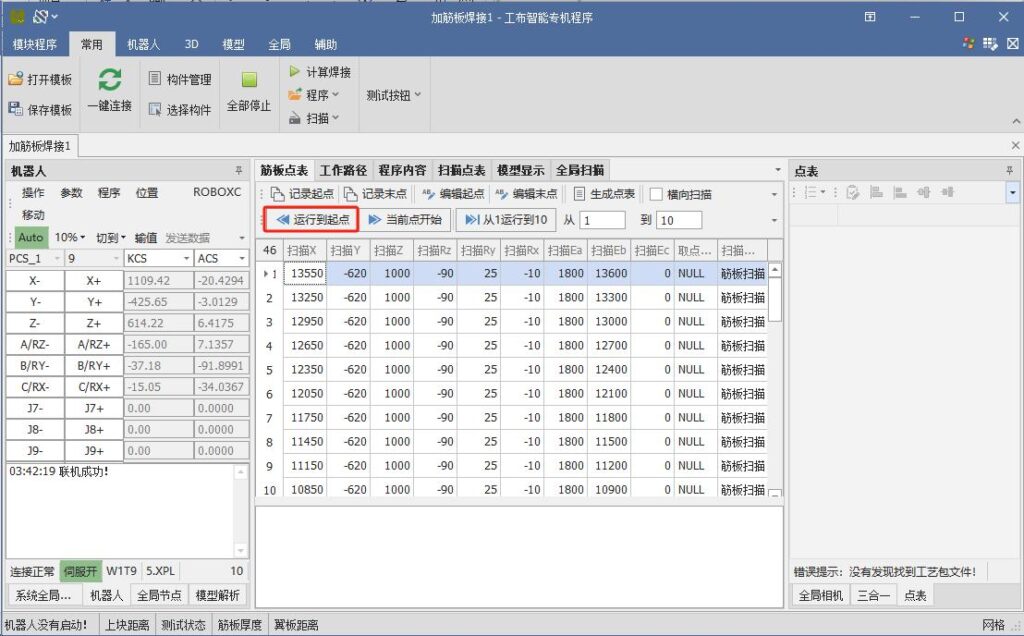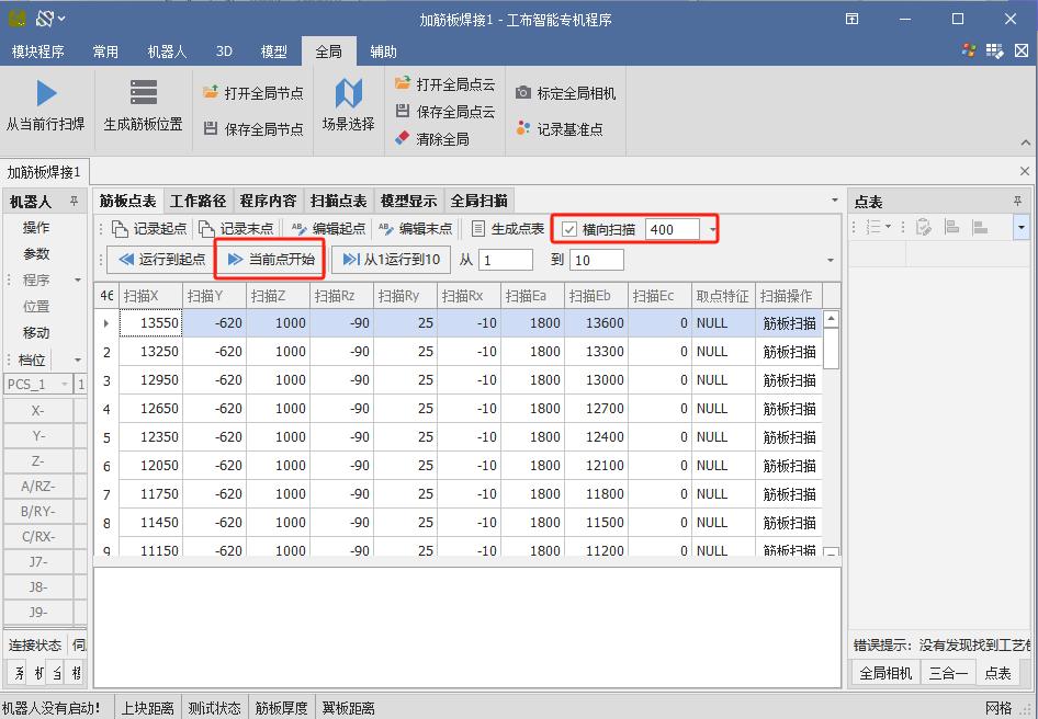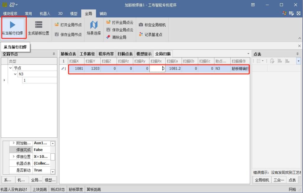 After recognition is complete, click the first identified node with the mouse, then click “Start Scan Welding from Current Row.” The robot will begin the scan welding operation.