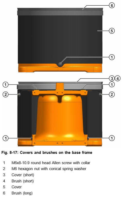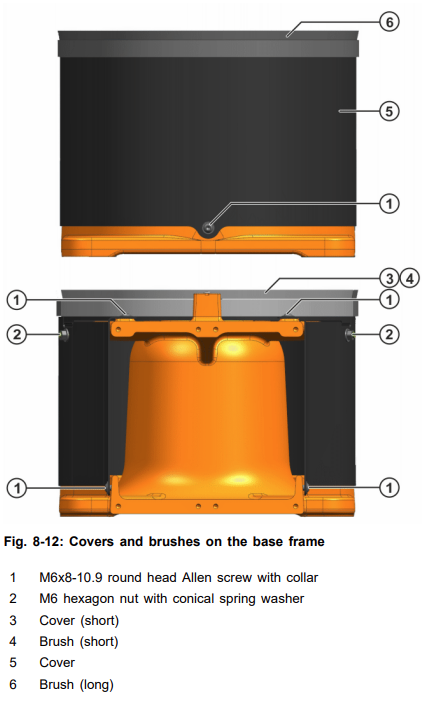 - Fasten the covers with 2 M6 hexagon nuts including conical spring washers and 5 M6x8-10.9 round head Allen screws with
