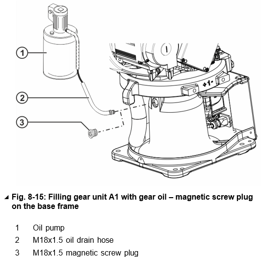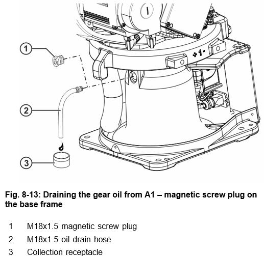- Unscrew the M18x1.5 magnetic screw plug on the base frame and screw in M18x1.5 oil drain hose.