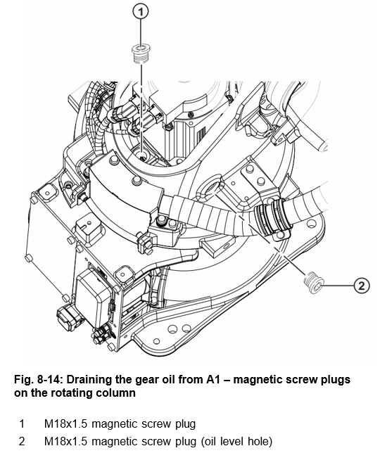 - Remove the M18x1.5 magnetic screw plugs from the rotating column for venting and catch the oil as it drains
