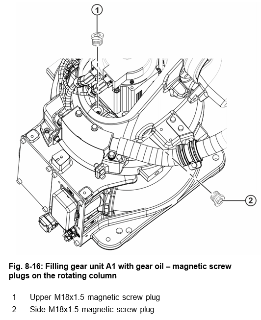 - Insert and tighten both M18x1.5 magnetic screw plugs on the rotating column; MA = 20 Nm.