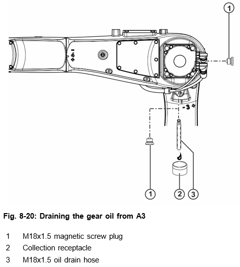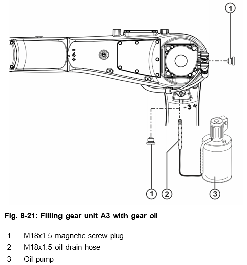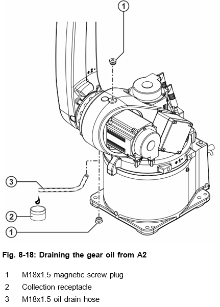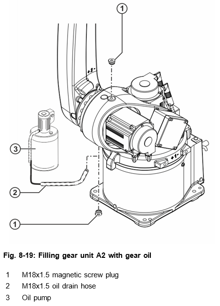 The following instructions describe the gear oil change for this axis. This description applies to floor-mounted robots. If the robot is installed in an inclined or suspended position, it must be ensured that all the oil can flow out. If necessary, the robot may have to be removed and bolted to the floor.