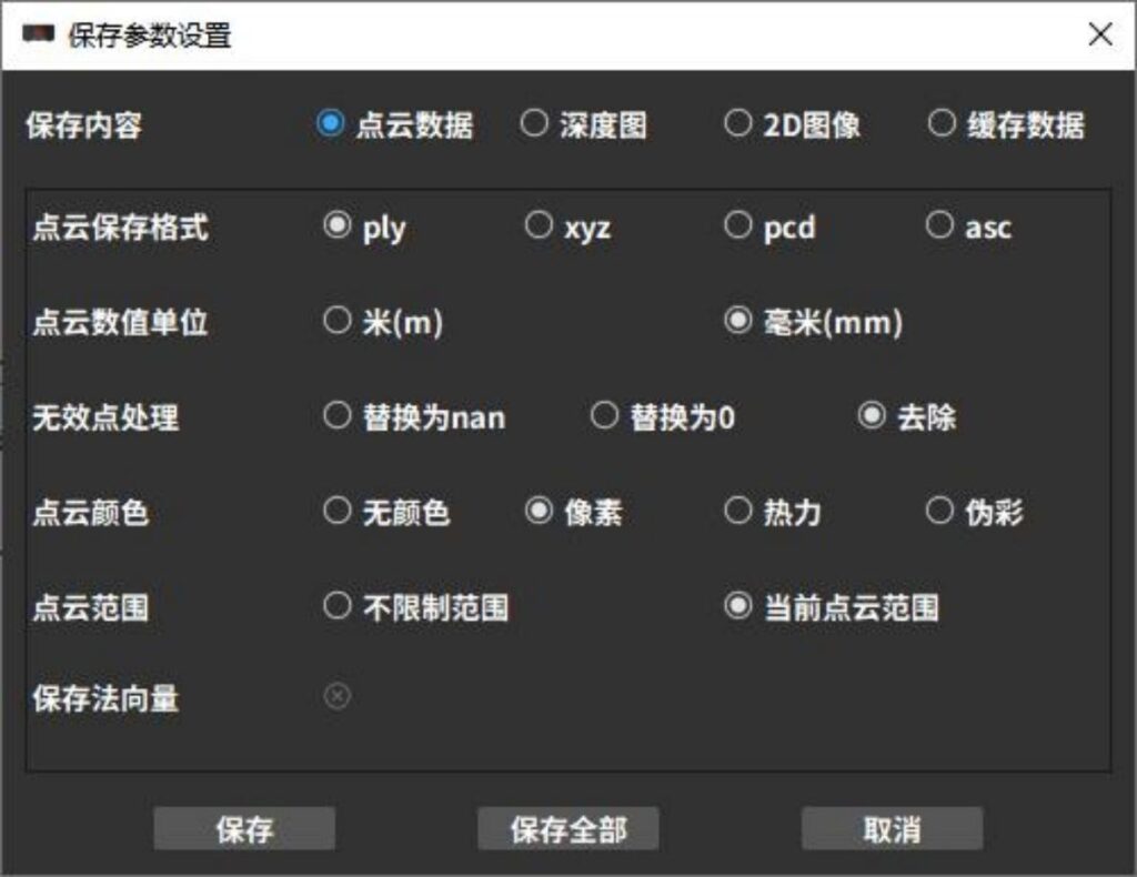 Save Point Cloud: Allows selection of save format, measurement units, point cloud range, and invalid point handling method. You can also choose to save normal vectors, point cloud color, and other information.